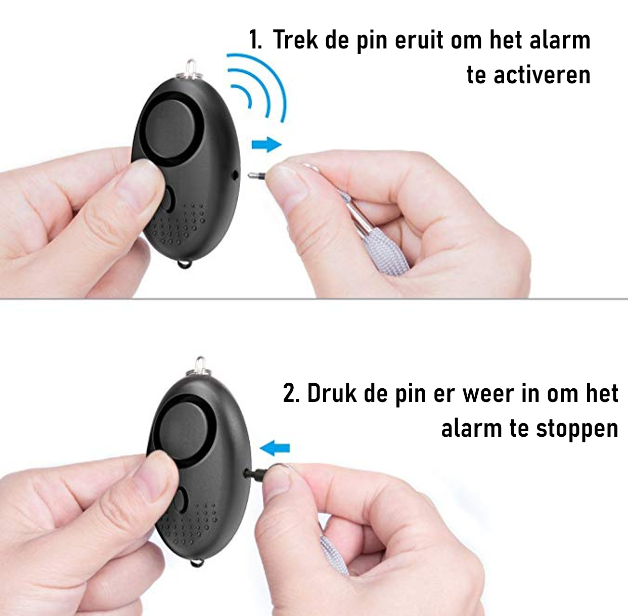Trek de pen eruit. Onmiddellijk klinkt een luide alarmtoon van liefst 130 decibel. Plaats de pen weer in om het alarmgeluid te stoppen en hem opnieuw te gebruiken. De pen is niet gemakkelijk te verwijderen. Het alarm is luid en ook op grote afstanden hoorbaar. Het heldere ledlicht is geschikt voor de verlichting van donkere gangen of voor het vinden van een sleutelgat.
